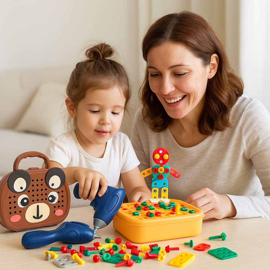 The Toolbox for Tiny Craftsman comes with a mini drill, 203 assorted pieces, and a convenient storage box—everything your child needs to explore, learn, and create. Order today and give your child the gift of hands-on learning, confidence, and hours of imaginative play!